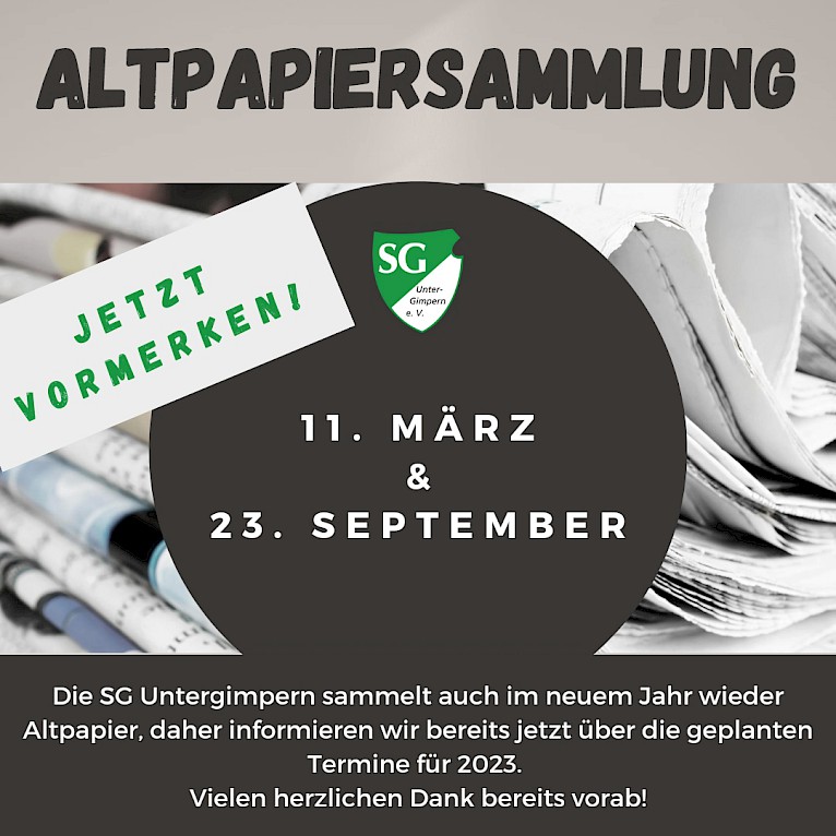 JETZT VORMERKEN & FLEISSIG SAMMELN: Die Sammeltermine für Altpapier im neuen Jahr 2023 stehen bereits fest! Wir freuen uns über jede Altpapierspende!