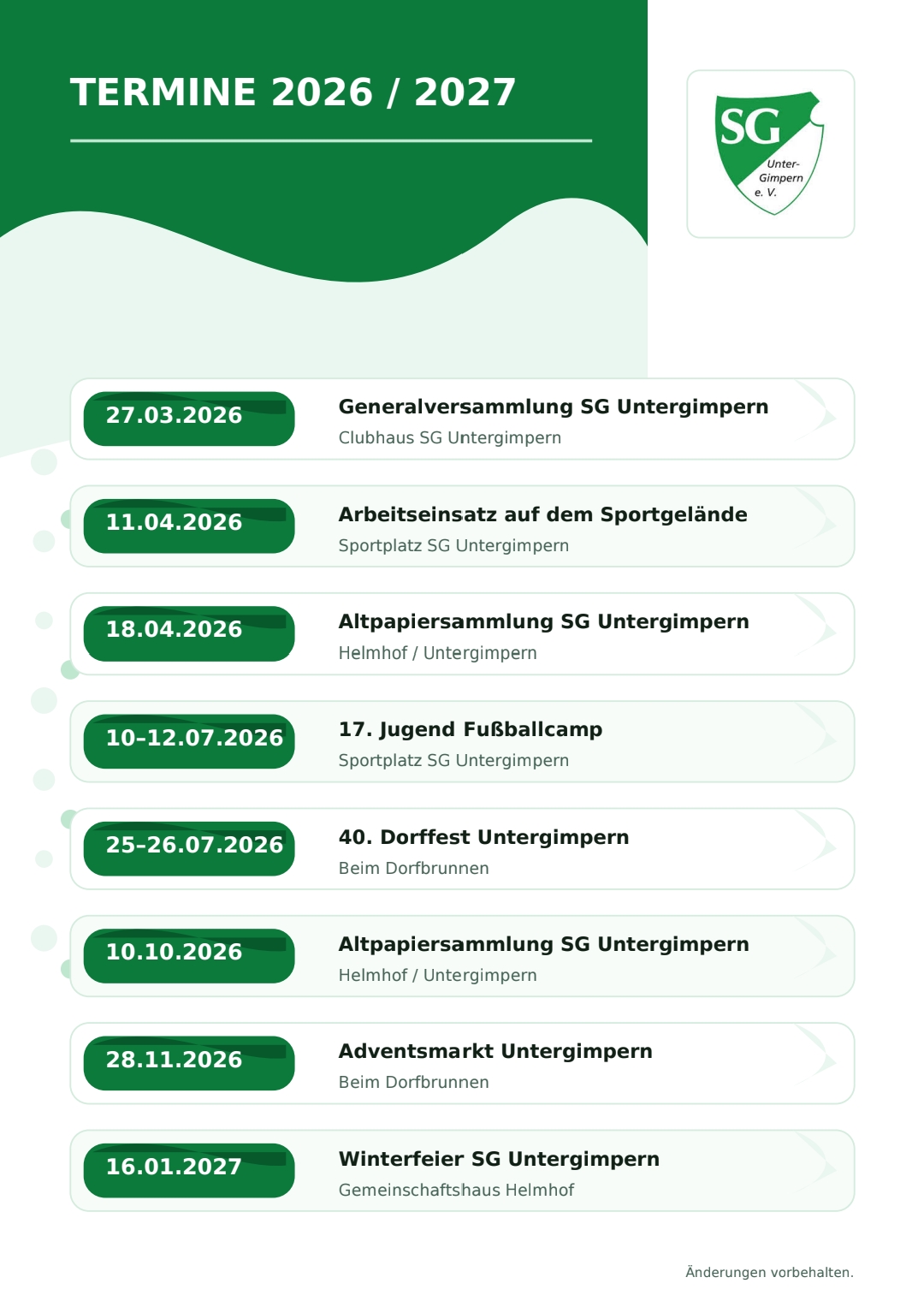 Die ordentliche Mitgliederversammlung der SG Untergimpern 1932 e.V. im Jahre 2026 findet am Freitag, 27. März 2026 um 19.30 Uhr im Sportheim der SG Untergimpern, Wagenbacher Weg, statt.          Die Tagesordnung umfasst folgende Punkte: Begrüßung durch den 1. Vorsitzenden Totenehrung Feststellung der Rechtmäßigkeit der Versammlung Feststellung der Stimmliste laut Anwesenheitsliste Genehmigung der Tagesordnung Rückblick auf das Jahr 2025 Kassenbericht Bericht der Kassenprüfer Jahresberichte Spielausschuss Senioren Jugendleiter Abteilungen (Frauenfußball, Alte Herren, E-Dart)  Aussprache über die Berichte  Entlastung der Vorstandschaft  Wahlen zur Vorstandschaft Kassenprüfer Sportplatzkassier Bestätigung Abteilungsleiter (AH, Damen, E-Dart)  Ehrungen  Bearbeitung eingegangener ... Weiterlesen