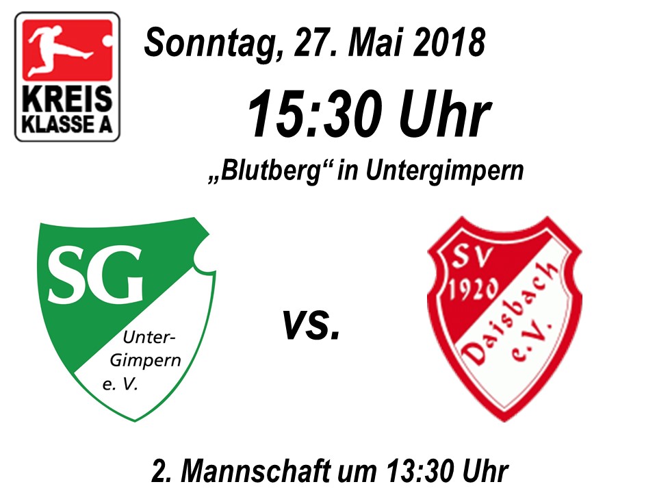 Untergimpern. Zum letzten Heimspiel der SG Untergimpern in der Verbandsrunde 2017/2018 in der Kreisklasse A gastiert der SV Daisbach am Sonntag, 27.05.2018 auf dem heimischen "Blutberg". Spielbeginn der 1. Mannschaft ist um 15:30 Uhr. Die 2. Mannschaften treffen bereits um 13:30 Uhr aufeinander. Zurzeit befinden sich die Gäste aus dem Waibstadter Stadtteil noch in akuter Abstiegsnot. Lediglich 2 Punkte trennen die Daisbacher vom Relegationsplatz. Deshalb werden ... Weiterlesen