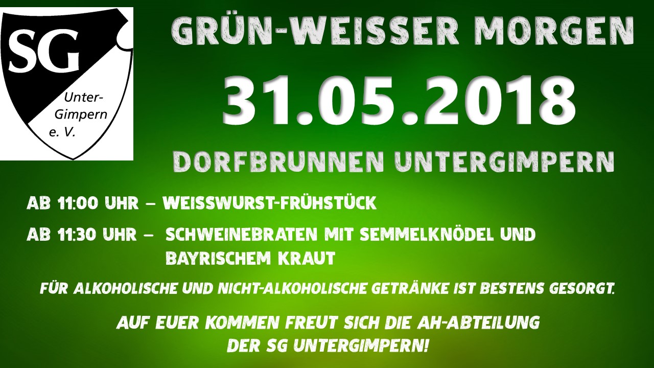 Untergimpern. Die AH-Abteilung der SG Untergimpern lädt am Donnerstag, 31. Mai 2018 (Fronleichnam) ab 11:00 Uhr zum "Grün-Weißen Morgen" an den Dorfbrunnen in Untergimpern ein. Mit einem Weißwurst-Frühstück beginnt der vor zwei Jahren ins Leben gerufene Event, der sich mit einem leckeren Mittagessen ab 11:30 Uhr fortsetzt. Dann gibt es Schweinebraten mit Semmelknödel und bayrischem Kraut. Die AH-Abteilung lädt die gesamte Bevölkerung aus Untergimpern und den umliegenden Gemeinden ... Weiterlesen