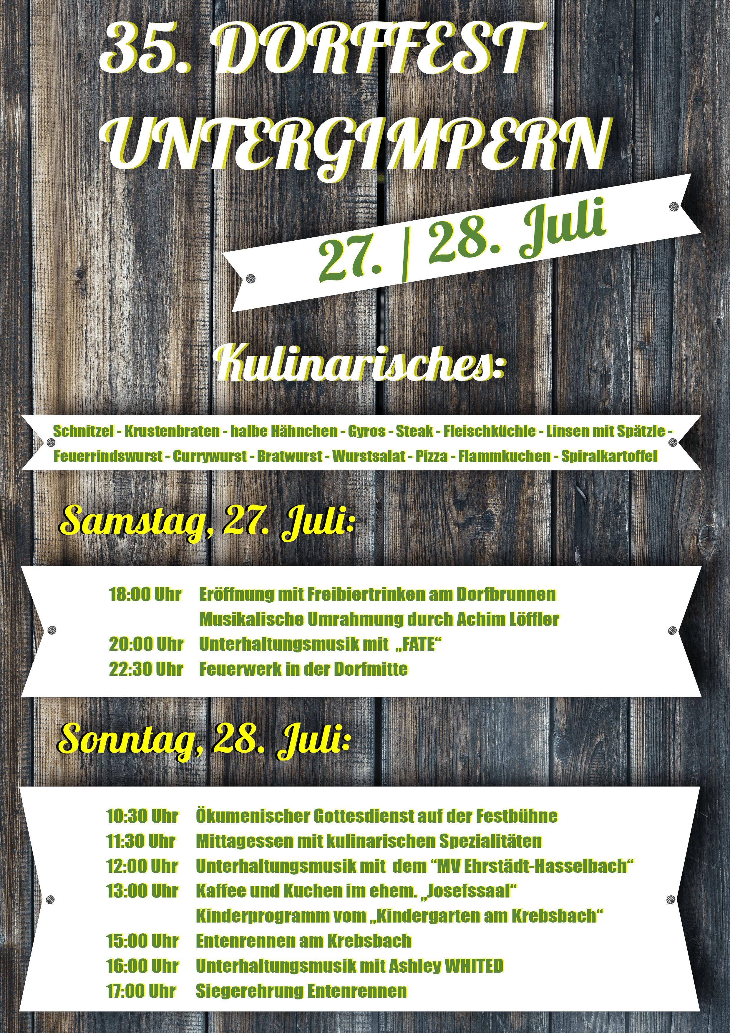 Musik, Feuerwerk, Freibier und kulinarische Genüsse garantiert Untergimperner Dorffest geht in die 35. Auflage - Mit dem Entenmörder zum Entenrennen Untergimpern. Mit viel Musik, einem tollen Feuerwerk, Freibier aus dem Dorfbrunnen und zahlreichen kulinarischen Genüssen wartet in diesem Jahr die 35. Auflage des Untergimperner Dorffestes auf. Am Wochenende 27. und 28. Juli begrüßt die „Arbeitsgemeinschaft der örtlichen Vereine Untergimpern“ ihre Gäste mit einigen feinen Attraktionen. Bereits zum Festauftakt am ... Weiterlesen